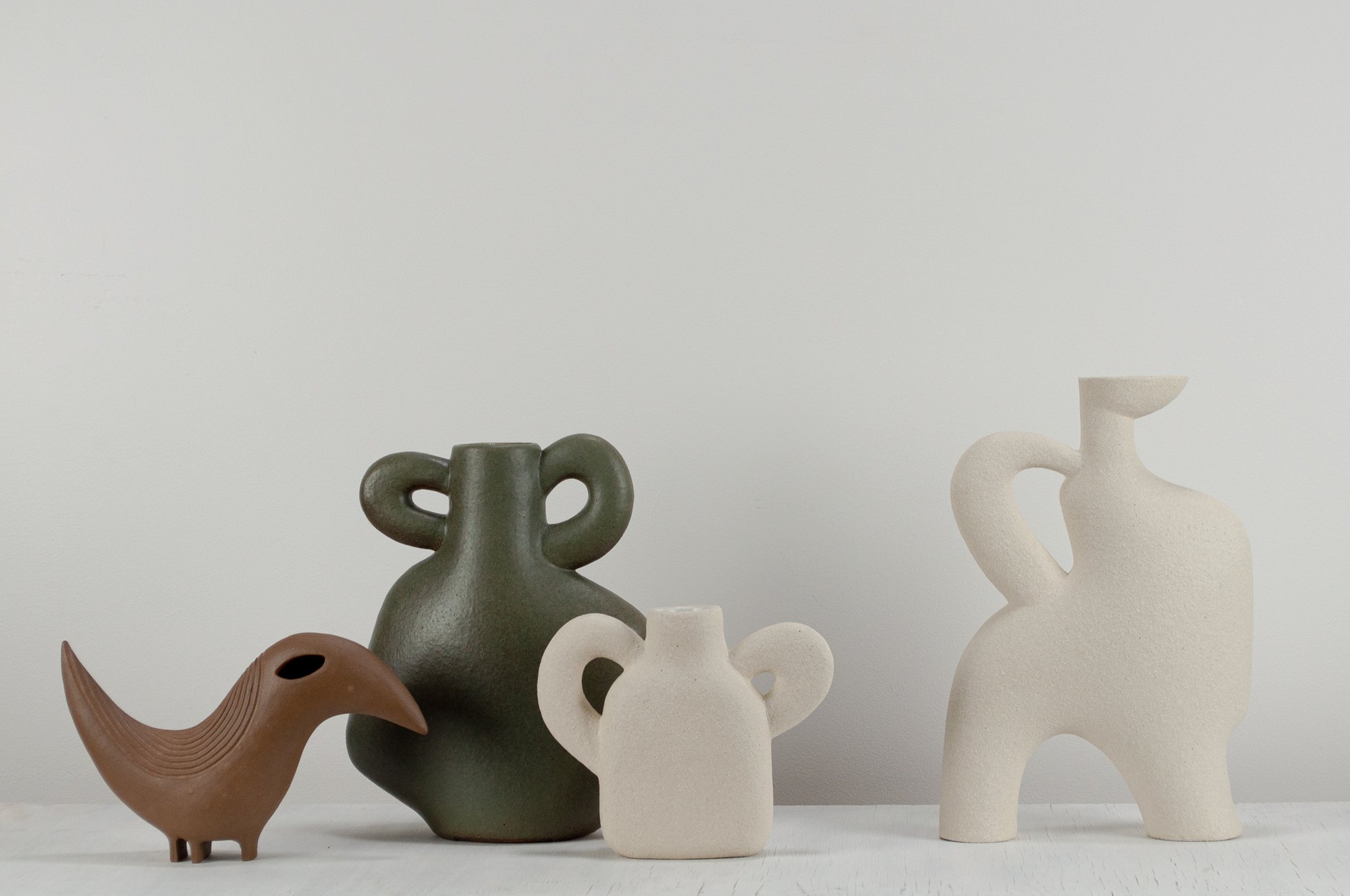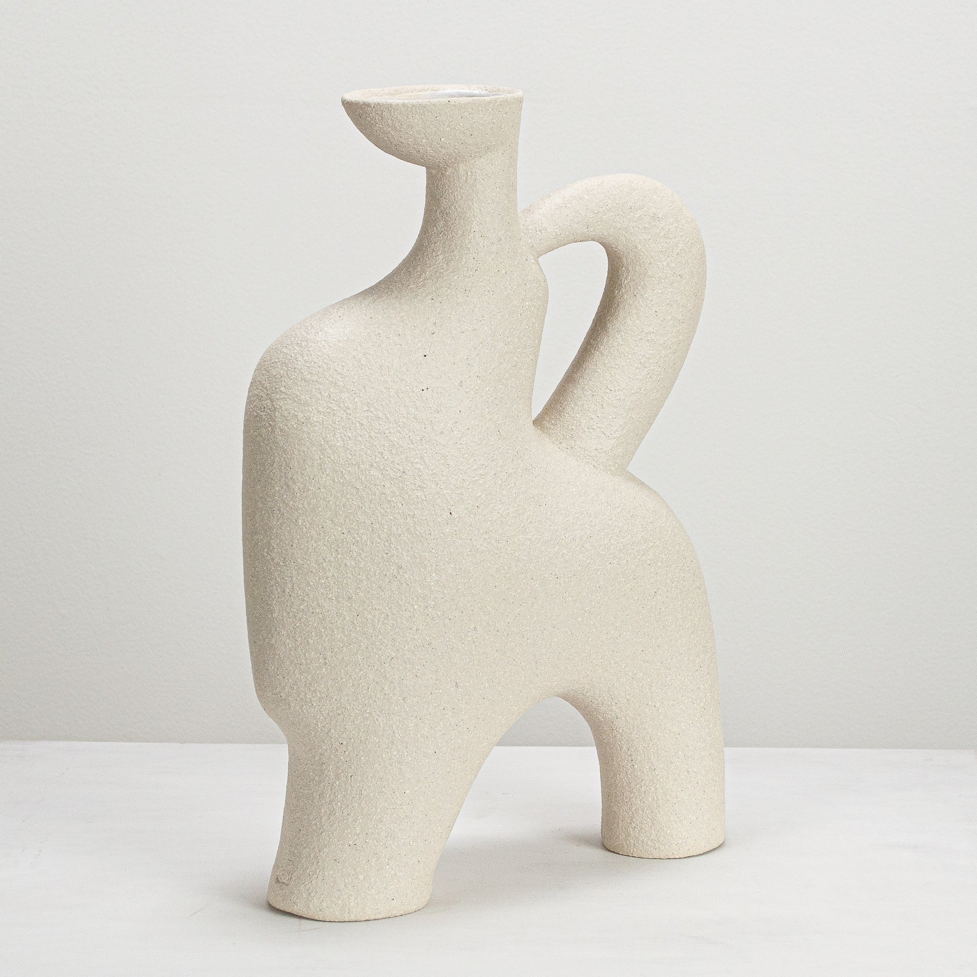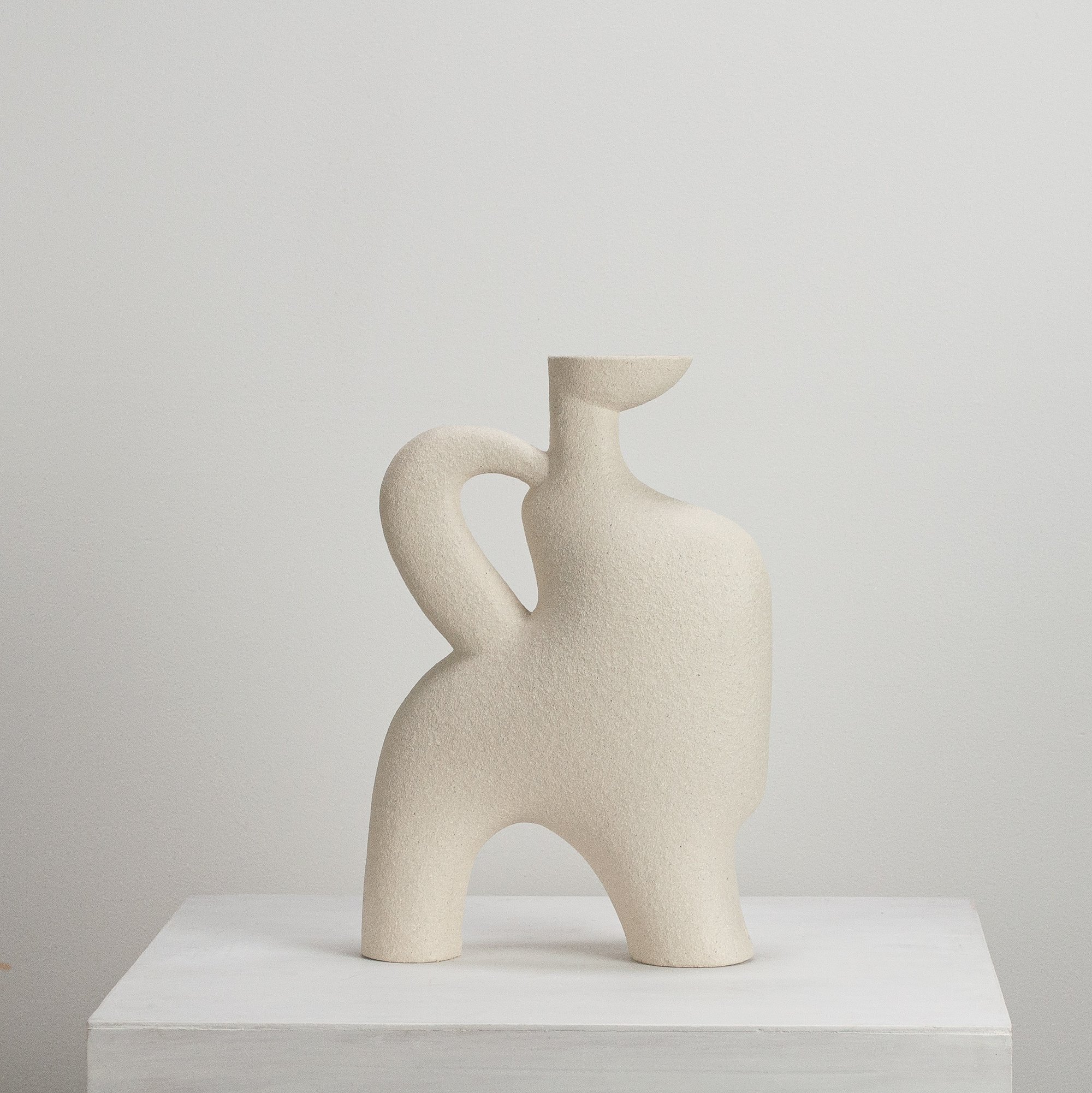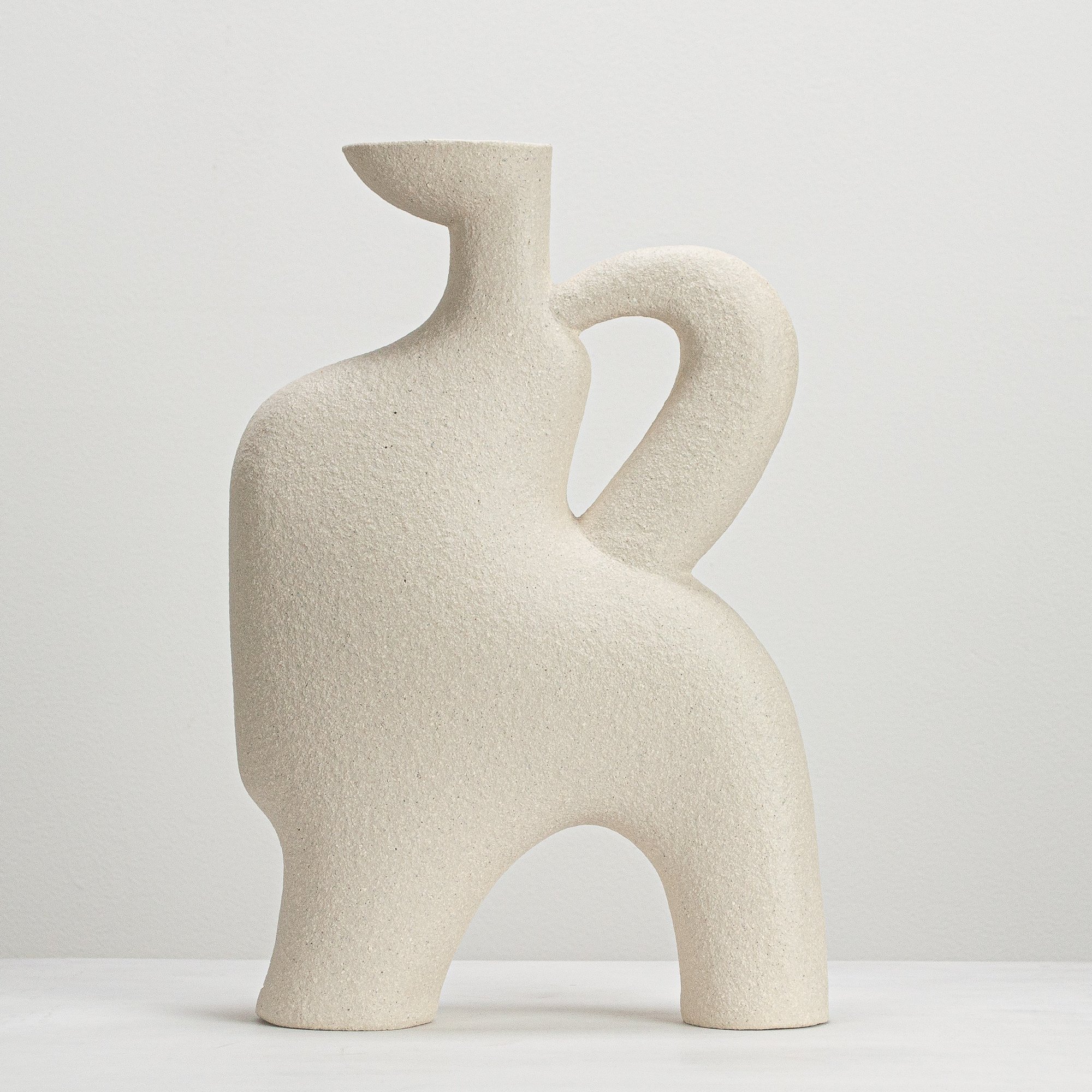 Stoneware sculptural vessel with lining glaze and a warm white, stoney finish. Suitable for use as a vase.