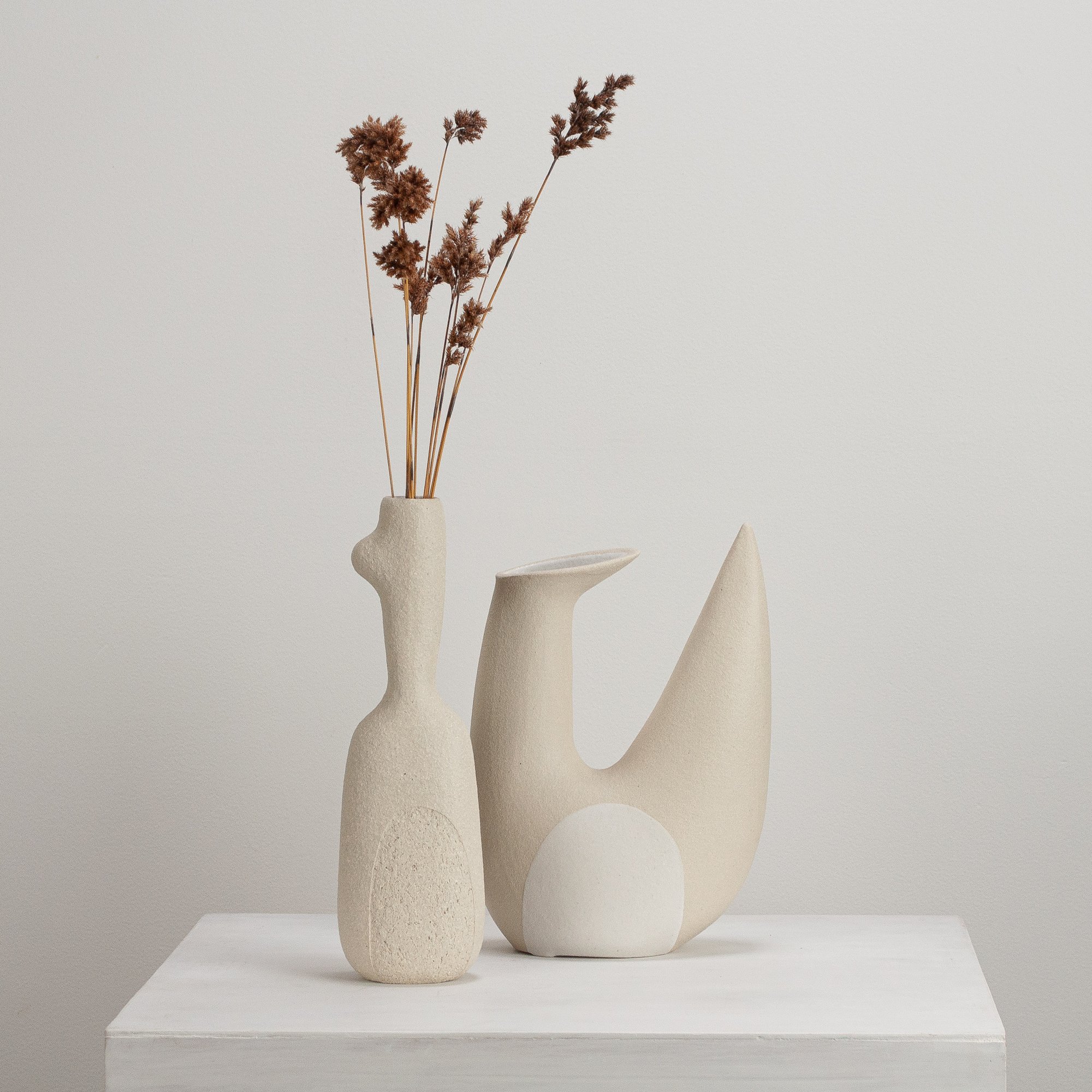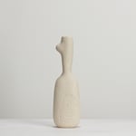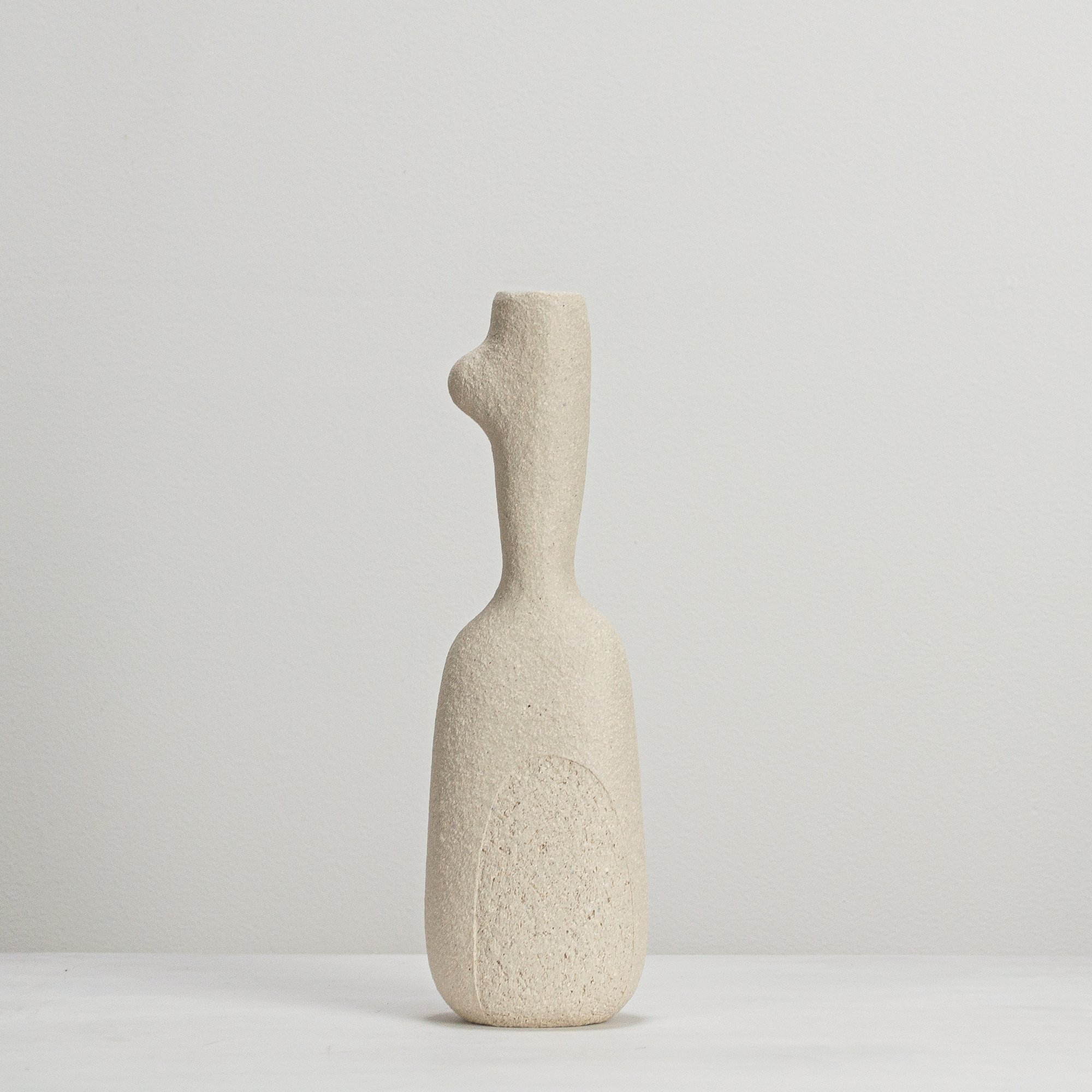 Unglazed stoneware sculptural vessel with a warm white, stoney finish. Sculptural vessel, suitable as a vase.