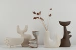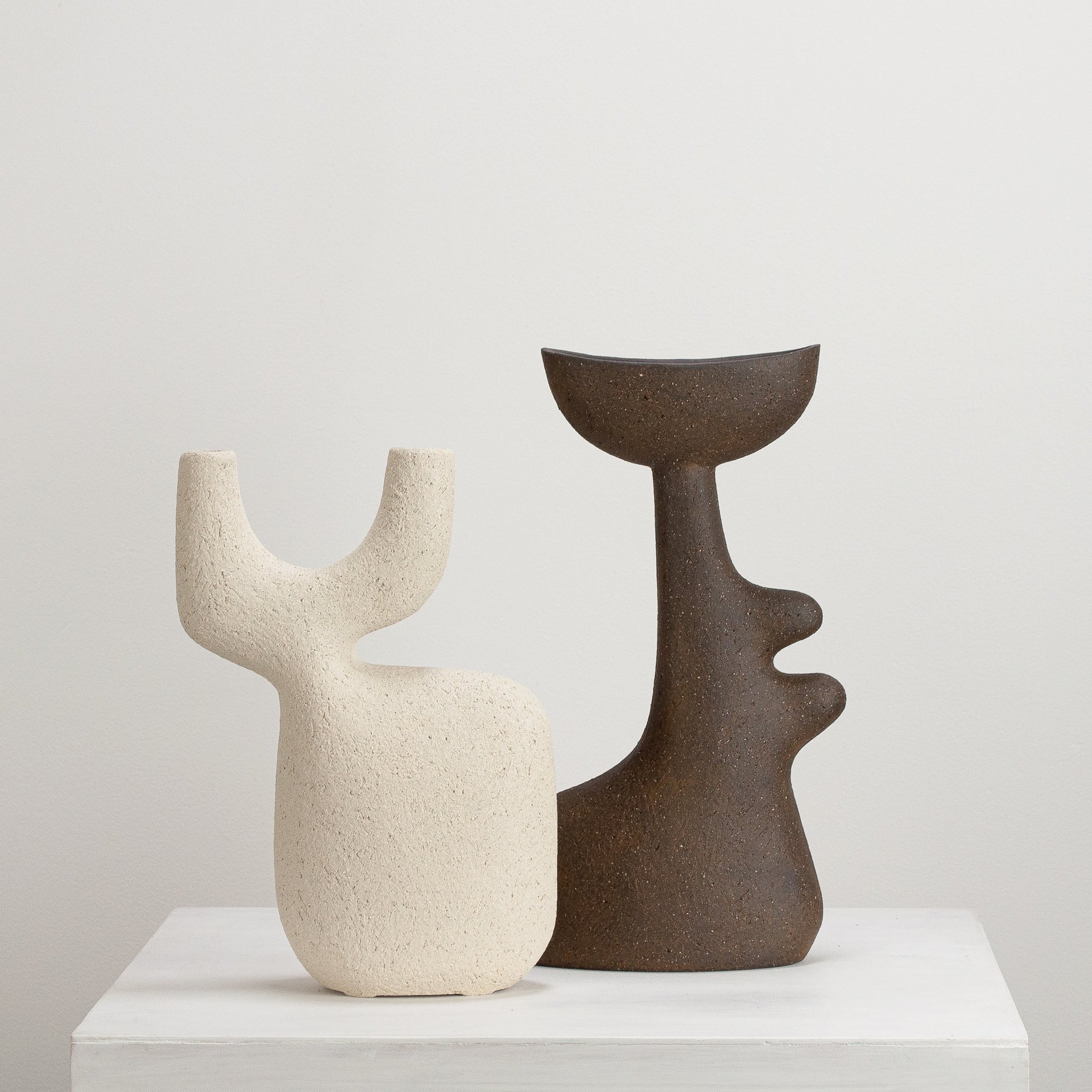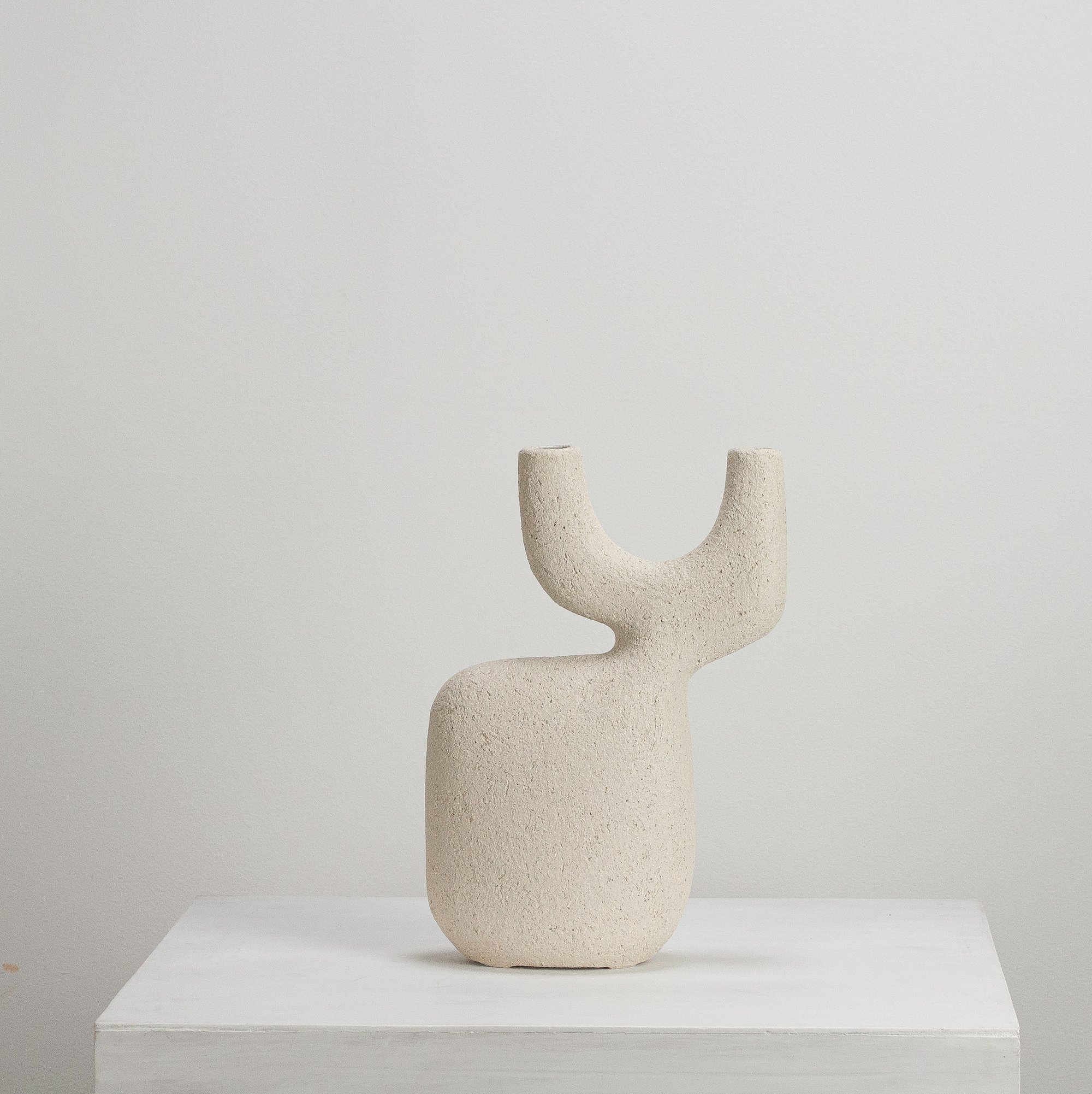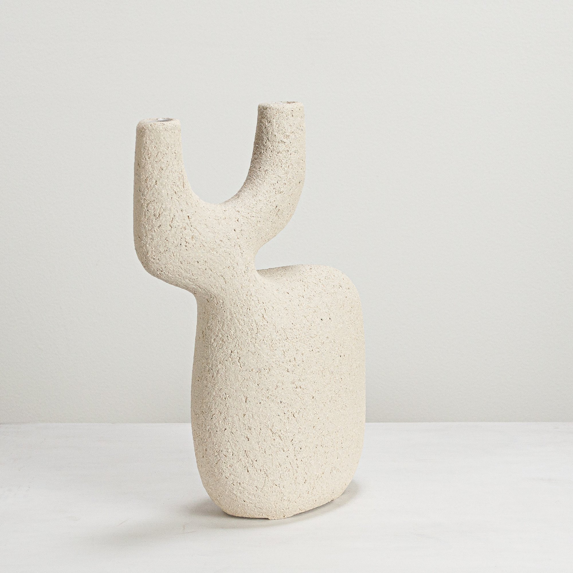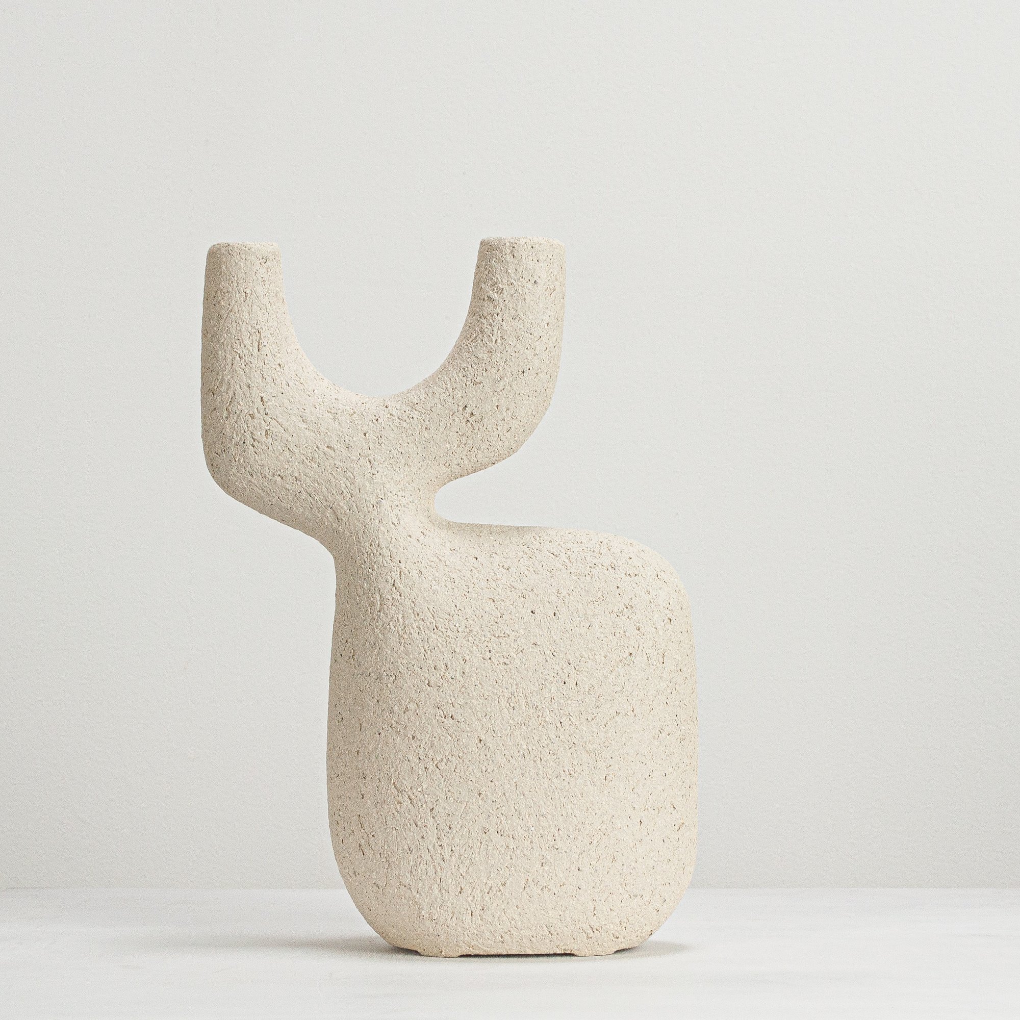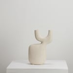 Stoneware sculptural vessel with lining glaze and a warm white, stoney finish. Suitable for use as a vase.
