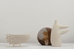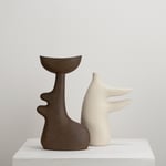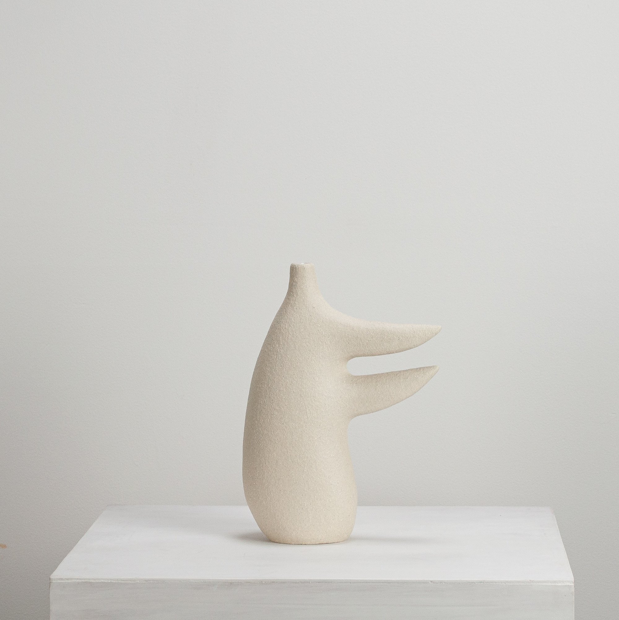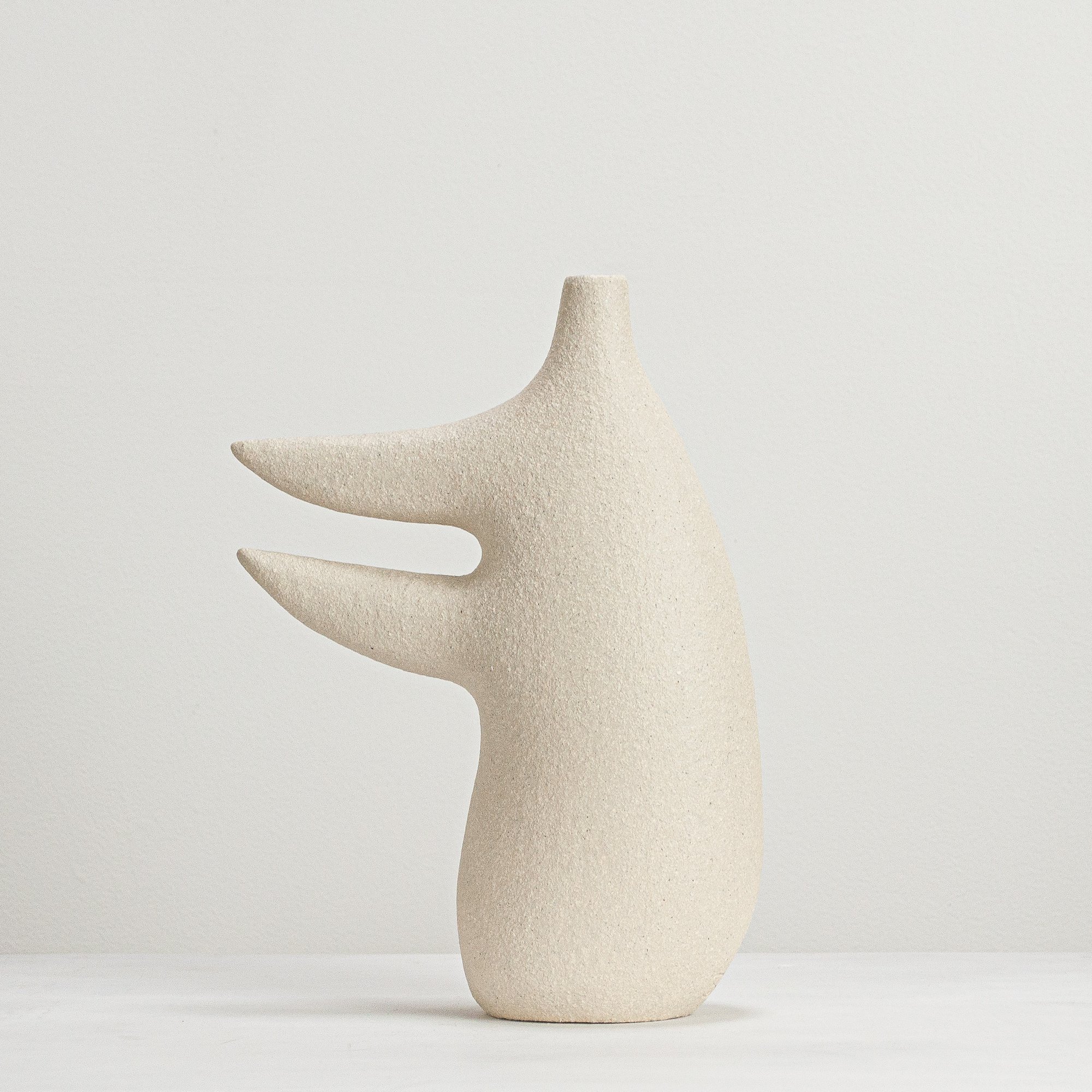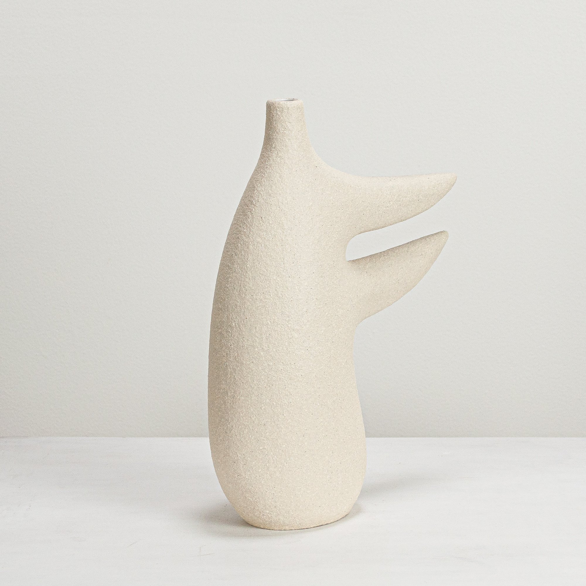 Stoneware sculptural vessel with a warm white stoney finish. Suitable for use as a vase.