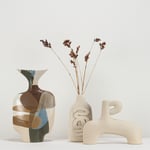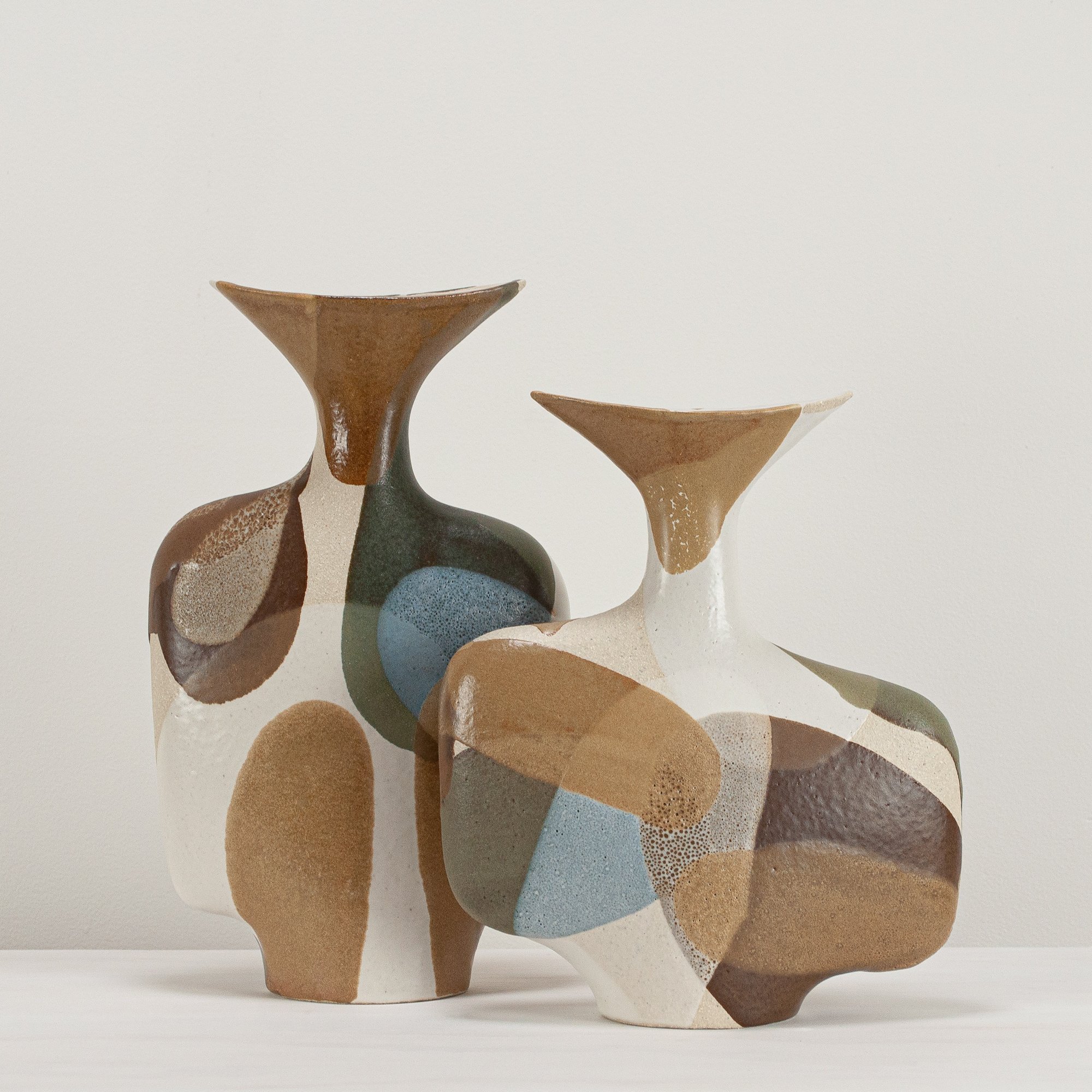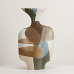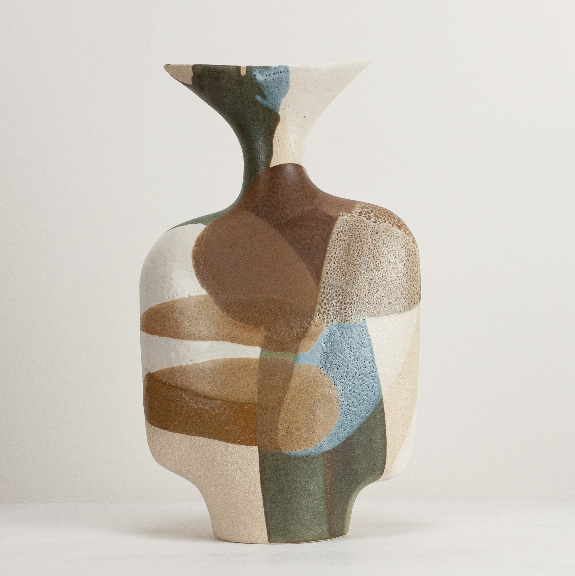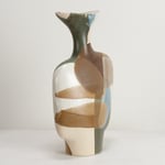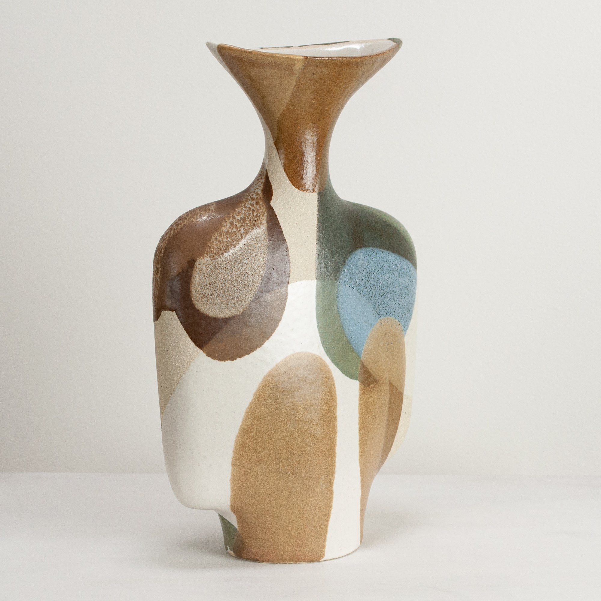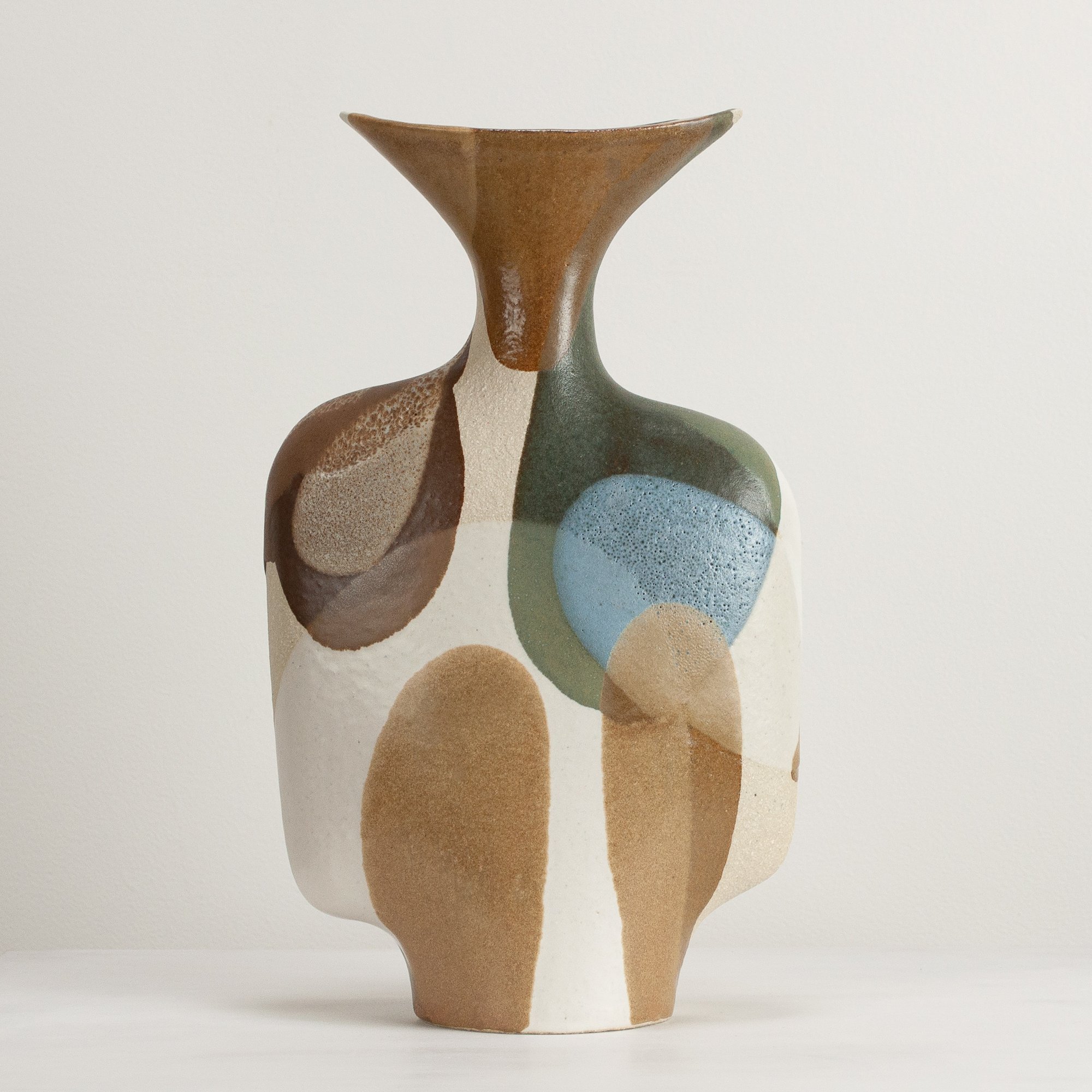 Stoneware sculptural vessel in overlapping, multi coloured, satin matt glazes. Suitable for use as a vase.
