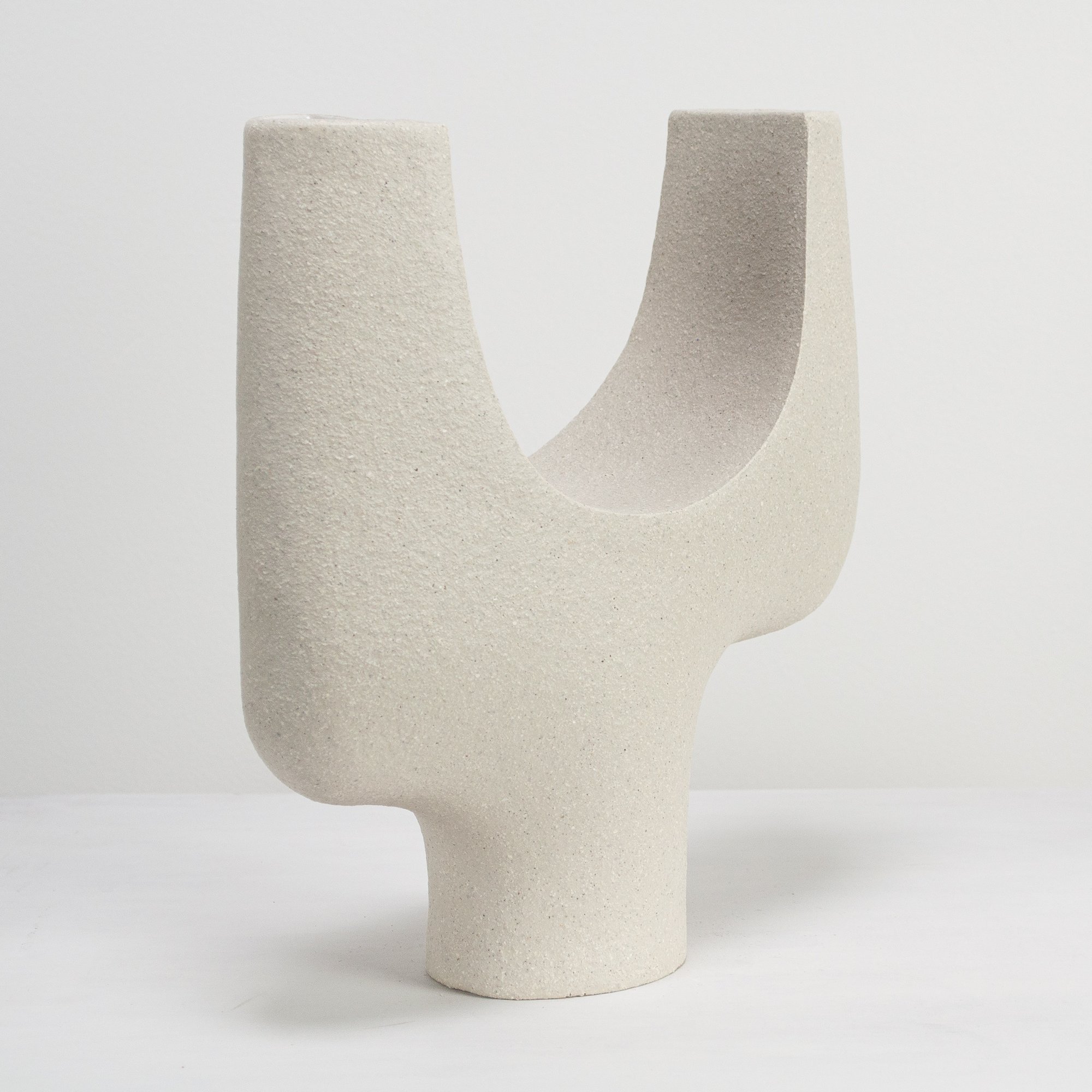 Unglazed stoneware sculptural vessel with a warm white, stoney finish. Sculptural vessel, suitable as a vase.
